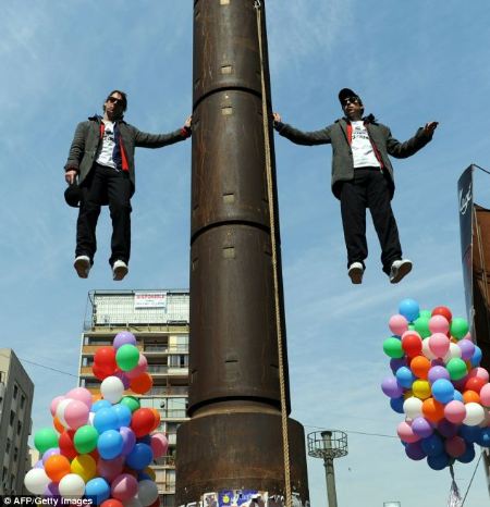 智利有一對「魔法雙胞胎」日前在首都聖地牙哥表演飄浮術,只見這對雙胞胎兄弟各用一隻手搭在大柱子上,就呈立姿「站」在空中200分鐘之久,打破了世界紀綠。