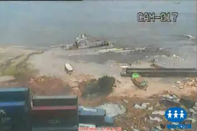 ,不知什麼原因港口忽然整個裂開,一個300米長的裂縫吞噬了港口的設備以及貨櫃箱,當時正在卸貨的工人也難逃這起突發性的災難。