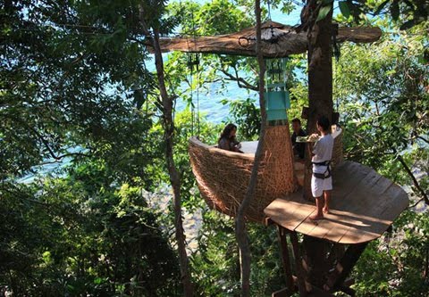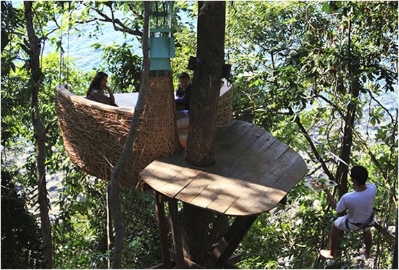 想像小鳥一樣鳥瞰海景,在優遊的天空中用餐嗎?泰國的蘇尼瓦奇瑞度假村可以滿足你的需求。全球第一間建造在5公尺樹上的「鳥巢餐廳」,使用 柳樹編織成鳥巢形狀的外觀,四周被茂密的雨林包圍,但是用餐價格可不便宜,兩人吃一餐要1萬4千泰銖(台幣約1萬3千元)。