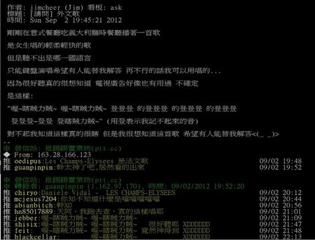這名網友表示知道自己這樣真的很瞎,不過由於太想知道這首歌名,希望有人能 替他解答,除了貼出歌詞發音大概是:「喔~瞎賊力賊~ 喔~瞎賊力賊~」,自己還不好意思的說其他聽不懂的就用「登登登」帶過,如此天馬行空的提問,想不到短短三分鐘,就有一位淡定鄉民指出:「Les Champs-Elysées是法文歌」,讓網友讚嘆的紛推一樓是神人:「我雙腳一軟,跪拜在地朝聖」;甚至有人還感嘆,雖然也懂法文,但卻 無法一眼就看 出。
