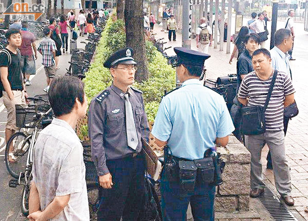 網上昨流傳多幅內地公安人員疑越境「執法」的相片,相中男子身穿內地警察制服,肩膊上有「三粒花」,官階相等於本港總督察級人員,他在水貨 客聚集的上水港鐵站出現,並與數名本港軍裝警員並排站立;其餘照片則顯示,該名「公安人員」高舉標語,本港警方人員上前了解。