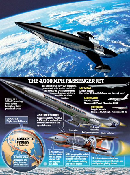 英國航天公司Reaction Engines正研發新型超音速客機LAPCAT A2, 可大幅縮短飛行時間,甚至成為搭載人造衛星的廉價航天工具。機體採用革命性的引擎設計周三獲歐洲太空總署(ESA)批核通過,LAPCAT A2為 航天革命邁進一大步。