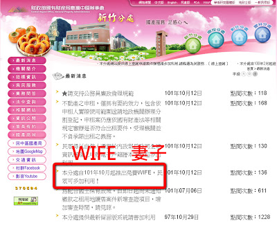 國有財產局新竹分處網頁鬧出大笑話!網頁在十月十二日發布一則新聞稿,寫著「本分處自101年10月起推出免費WIFE(免費老婆),民眾可多 加利用!」,有眼尖的網友發現後,截圖轉貼在臉書上,也吸引不少網友轉分享,諷刺新竹分處「有免費老婆可用」。