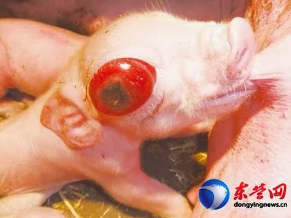 山東東營市近日驚現大眼外星豬!墾利縣一名張姓村民家中的母豬,周一晚產下八隻小豬,其中一隻雙眼通紅腫脹,右眼更突出如雞蛋,猶如外星 豬。張不清楚為何小豬雙眼奇特,其他村民亦嘖嘖稱奇。